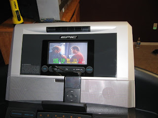 As you can see, it has a little TV monitor built in. We have it hooked up so whatever is showing on the big screen will also show on the little one here (hence, Voyager). We can also hook up a DVD player if we wanted. The workout display can be shown along the bottom of the screen, the right side, or hidden. It shows your distance, time, pulse, calories, and speed.